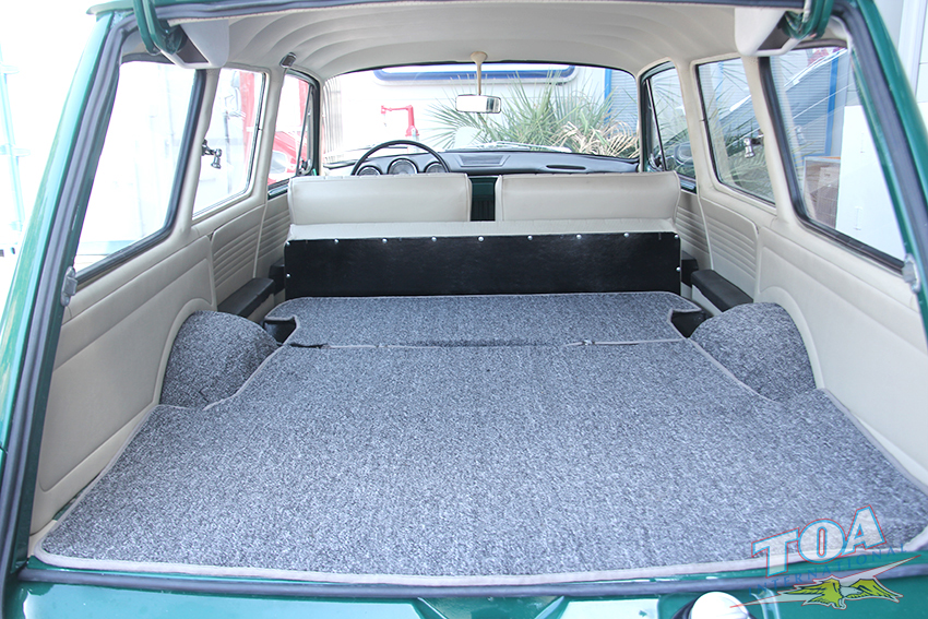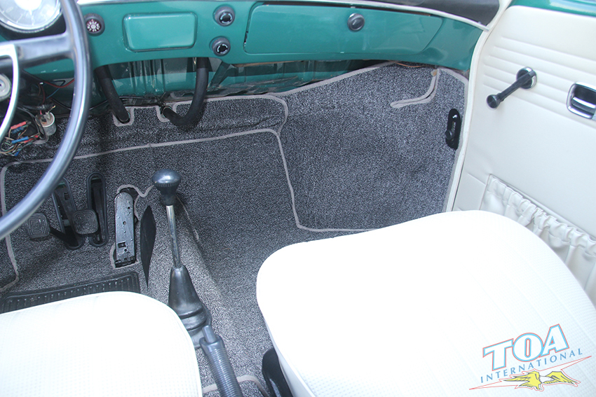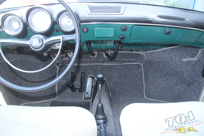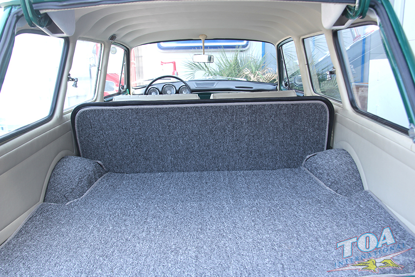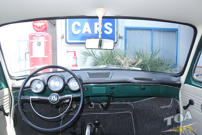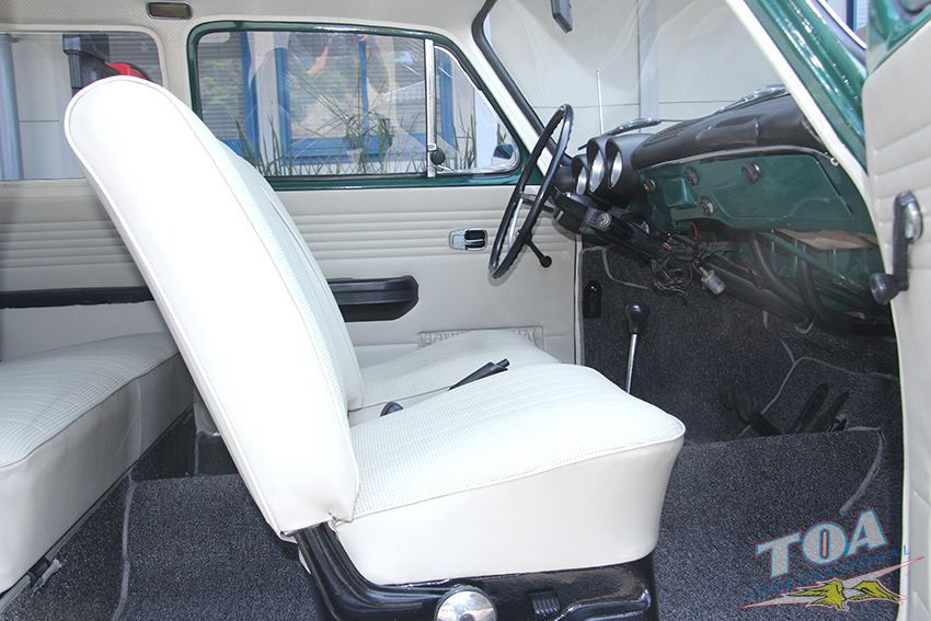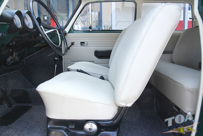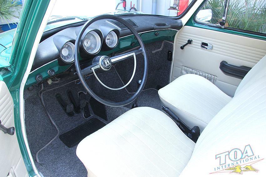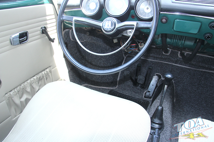 特にフェンダービーディングは、オリジナルNOSボディカラーにマッチしたペールグリーンを使用してボディに違和感なくマッチしています。 インテリアもドアパネル、シートカバー、カーペット等オリジナルスタイルで張替え清潔感&オリジナル感一杯です。