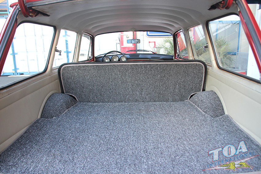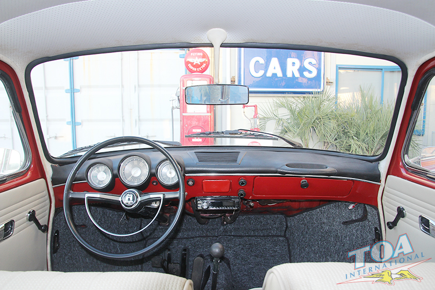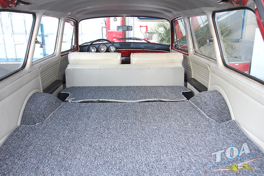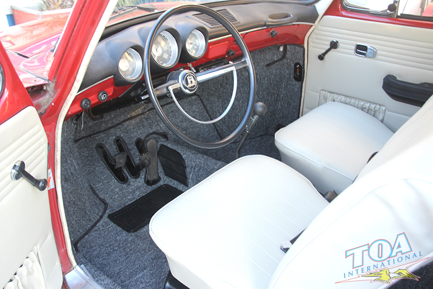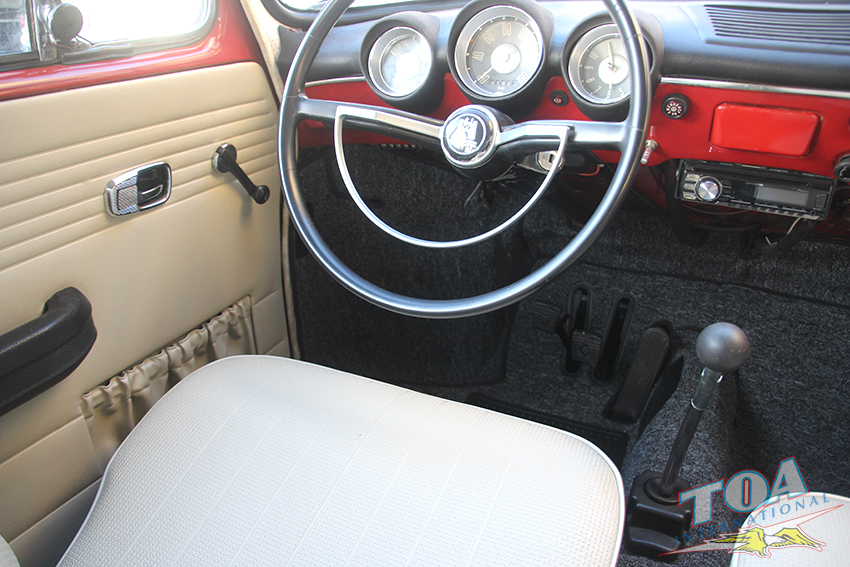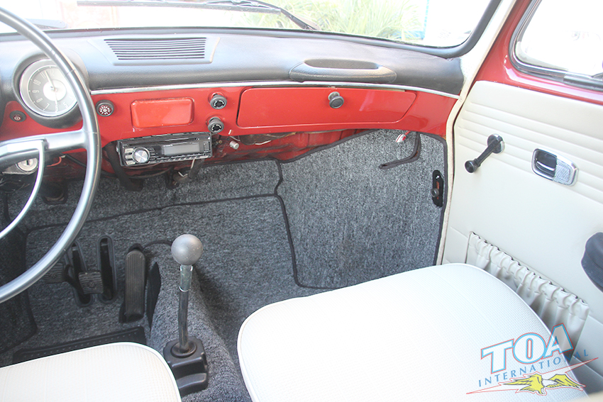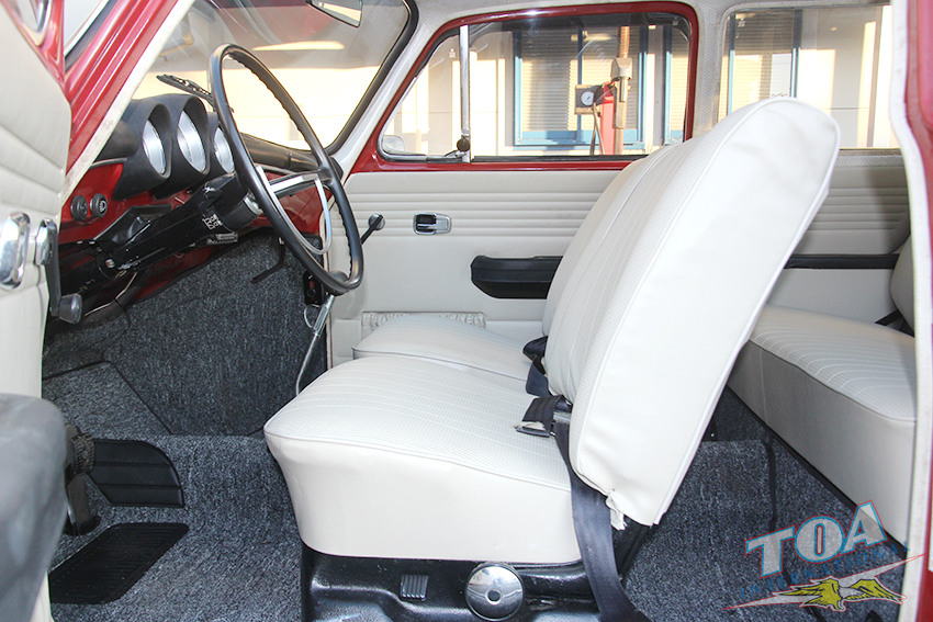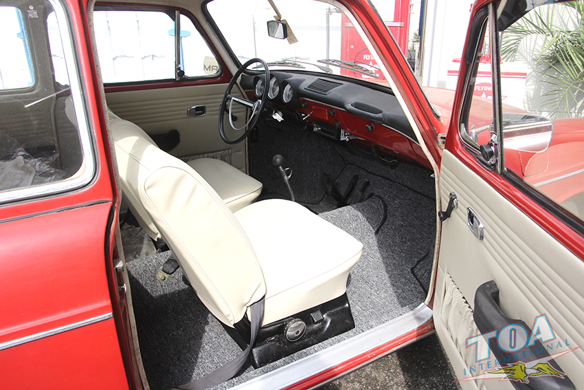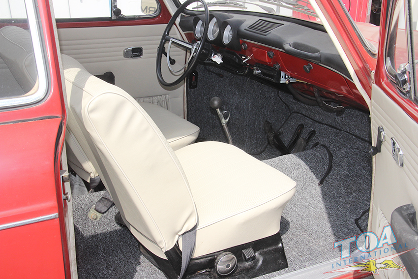 インテリアは、オリジナルスタイルオフホワイトドアパネル・オリジナルスタイルオフホワイトシートカバー・ソルト&ペッパーカーペットで張り替え、ヘッドライナーも綺麗な状態で清潔感一杯です。